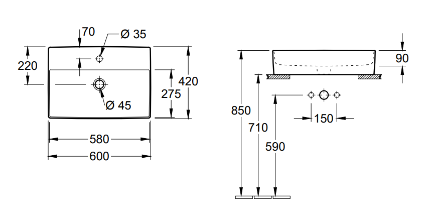 - Spód umywalki: Nieszlifowany