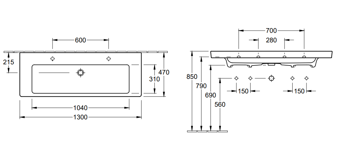 Umywalka VILLEROY&BOCH SUBWAY 2.0 130x47cm, 2 otwory, biała 7176D201