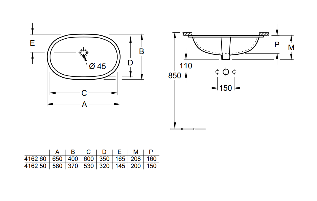 Wskazówki montażowe: wycięcie w blacie należy wykonać wyłącznie na podstawie oryginalnej umywalki, możliwy montaż w blatach z kamienia naturalnego i z tworzyw sztucznych