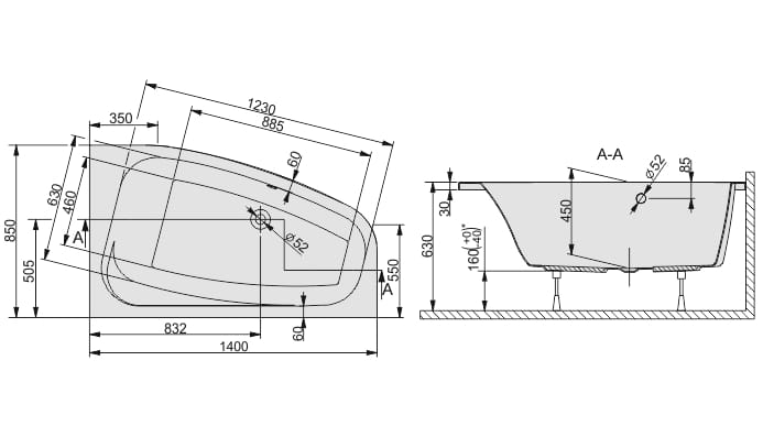 Wanna asymetryczna lewa lub prawa WAL(P)/FREE wykonana jest z akrylu sanitarnego i kompletowana ze stelażem. 45 cm głębokość wanny zapewnia optymalne warunki kąpieli a specjalnie uformowana półka może służyć jako miejsce na akcesoria i przybory kąpielowe.
