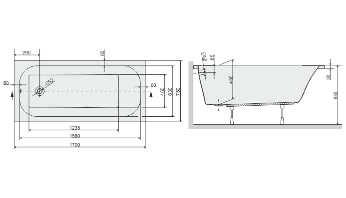 Wanna to doskonałe miejsce do relaksu o każdej porze. Seria Free Line zapewnia szeroką paletę wymiarową popularnych wanien prostokątnych. Już teraz wybierać można spośród 13 modeli. Wanna prostokątna WP/FREE wykonana jest z najwyższej jakości akrylu sanitarnego i kompletowana ze stelażem (nogami). Odpływ umieszczony jest z brzegu lub w środkowej części wanny (przy dłuższych modelach - do wyboru), co zapewnia wygodę kąpieli, również dla dwojga. 45cm głębokość wanny zapewnia optymalne warunki kąpieli.