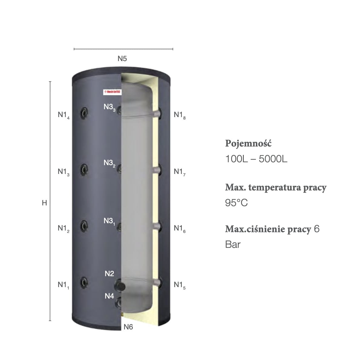 - Elastyczność Instalacji: Liczne porty podłączeniowe, w tym dla grzałki elektrycznej, termometru, czujnika, oraz powrotu cyrkulacji
