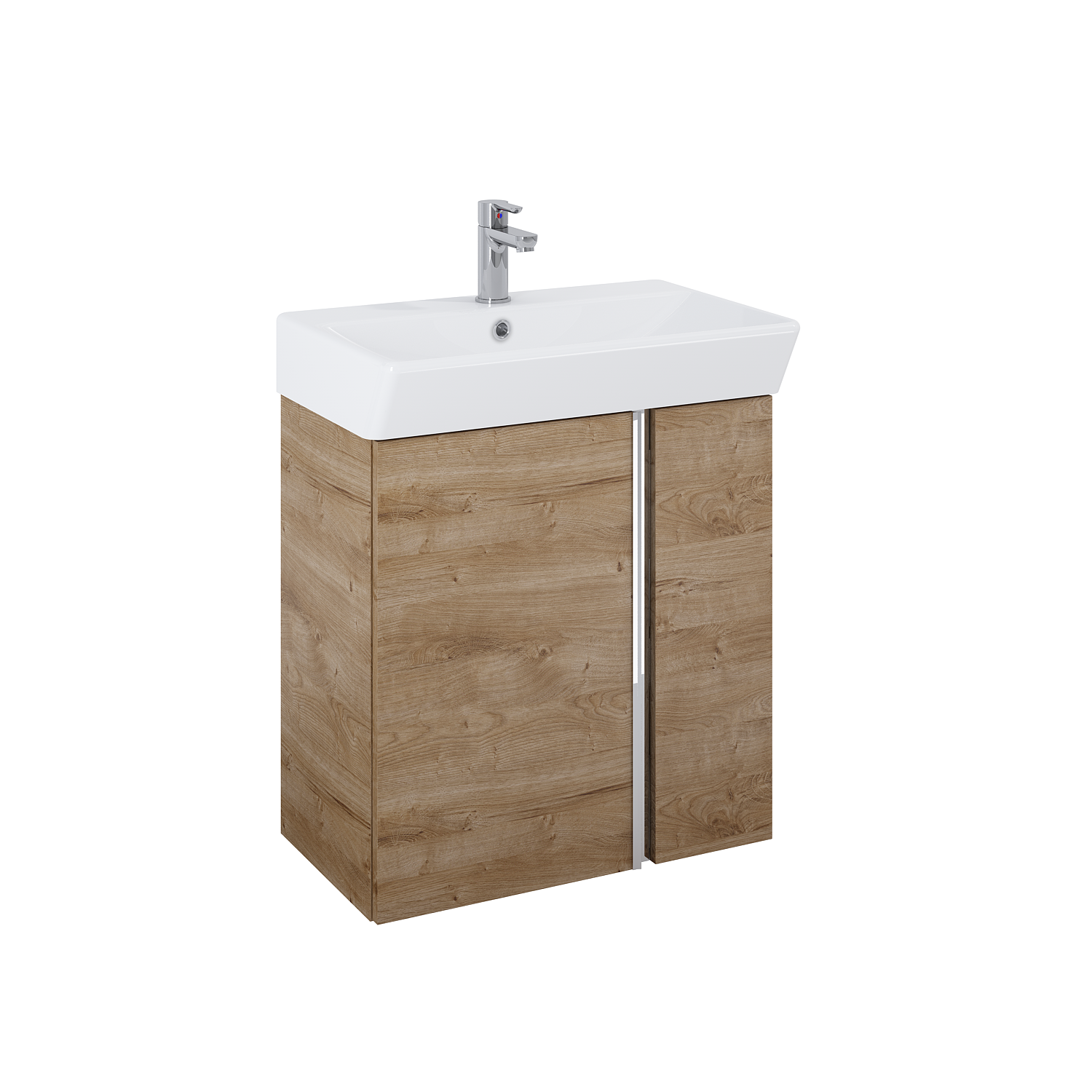 Set Skye 60 cm, wyposażony w asymetryczne drzwi z systemem soft – close i półkę z regulowaną wysokością. Set wykonany jest z materiałów wysokiej jakości, front i korpus z płyty laminowanej w kolorze canela oak. Chromowany metalowy uchwyt umieszczony jest pionowo, wzdłuż całej wysokości szafki. Set składa się z szafki podumywalkowej i umywalki o misie wyprofilowanej w elegancki sposób. Set doskonale prezentuje się z szafkami z kolekcji For All.