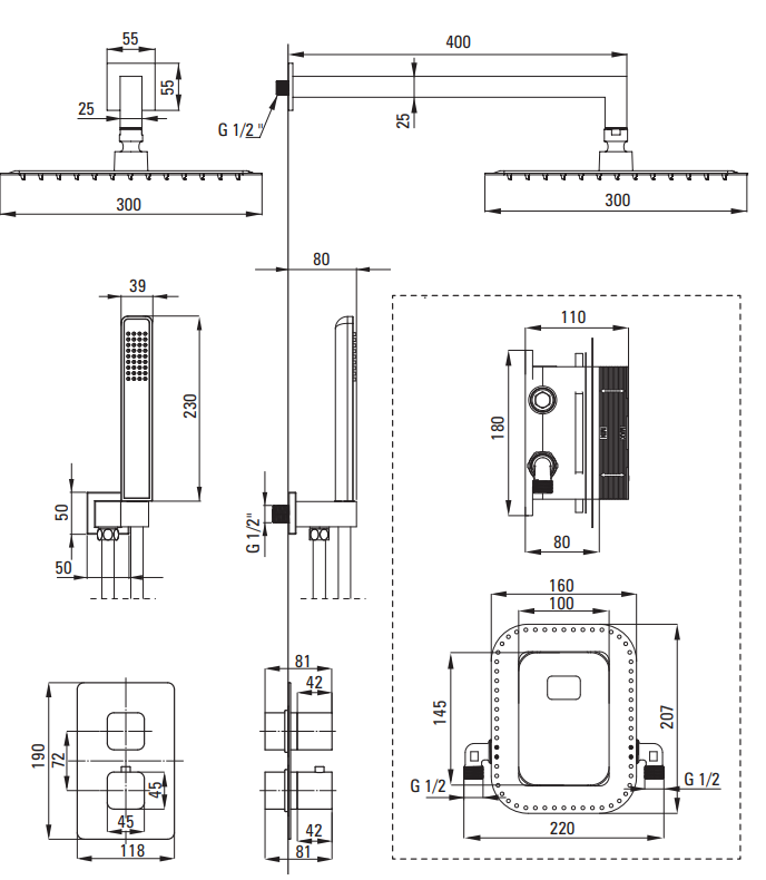 Zestaw prysznicowy podtynkowy składa się z termostatycznej baterii, prostokątnej głowicy natryskowej oraz słuchawki z optymalnym, deszczowym strumieniem i systemem Anti-calc, który przeciwdziała osadzeniu się kamienia. Kupując zestaw, masz pewność, że wszystkie elementy będą ze sobą idealnie pasowały. Montaż podtynkowy zapewnia estetyczny i minimalistyczny wygląd, w chromowe wykończenie wpasuje się zarówno w klasyczny jak i nowoczesny aranż.