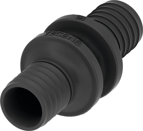 Złączka z wysokowydajnego tworzywa PPSU do łączenia rury wielowarstwowej TECEflex lub rury PE-X o tym samym rozmiarze za pomocą tulei zaciskowej, bez dodatkowych pierścieni uszczelniających typu O-ring (bez tulei zaciskowych TECEflex).