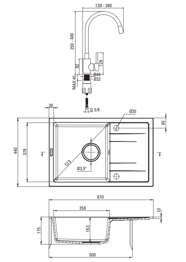 Fabrycznie wywiercone w zlewozmywaku otwory mają kilka zalet. Po pierwsze pozwalają na wybór strony prawej lub lewej, gdzie będziemy mieli ociekacz, dlatego zlewozmywak jest „odwracalny". Montaż jest łatwy i zwalnia z potrzeby kłopotliwego drążenia otworów samodzielnie. Oprócz tego otwory dają możliwość szybkiego dodania korka automatycznego lub dozownika na płyn do mycia naczyń.Dane techniczne
